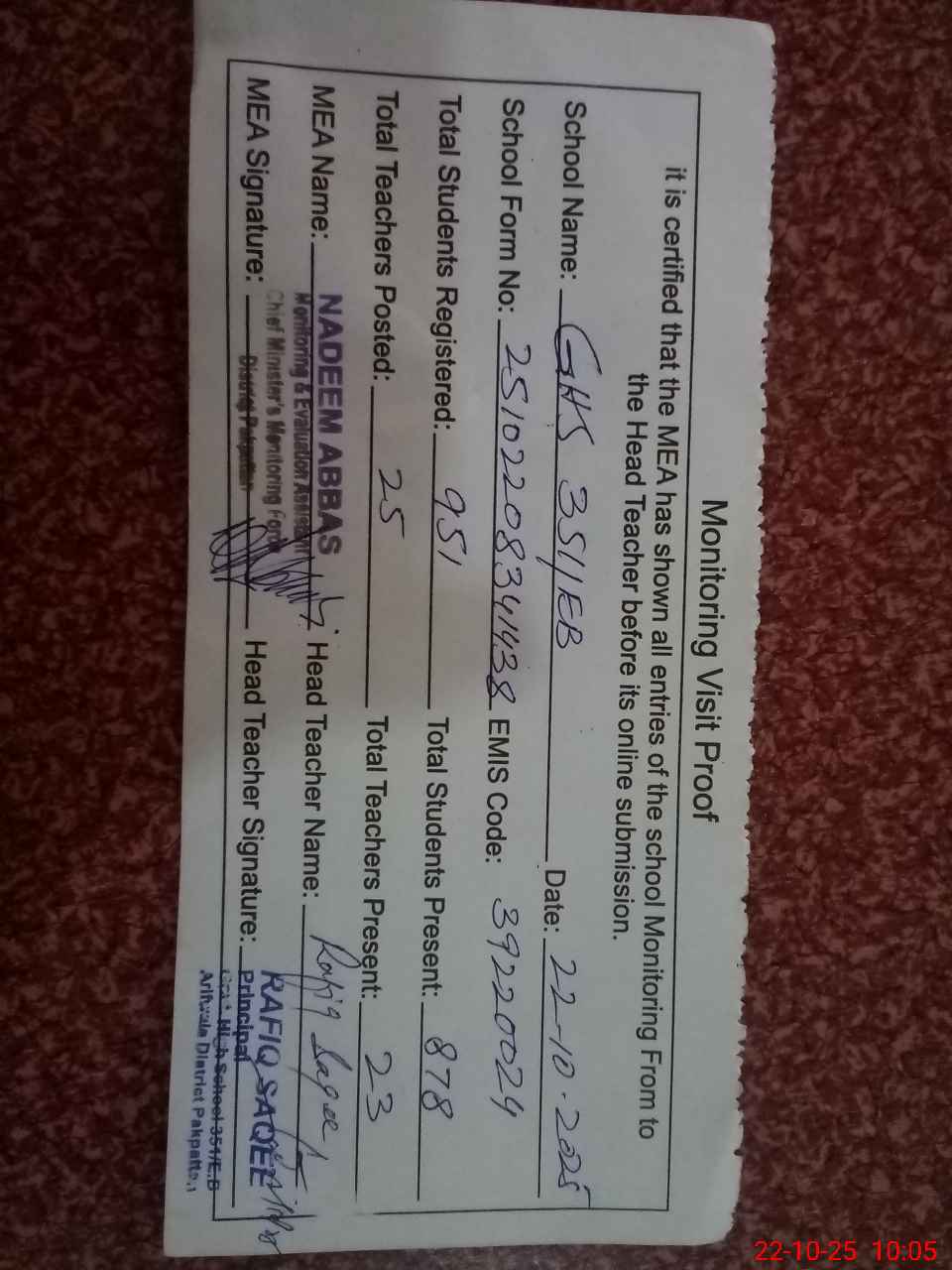 | EMIS Code: 39220024 | Name of School: GHS 351/EB ARIFWALA | |||