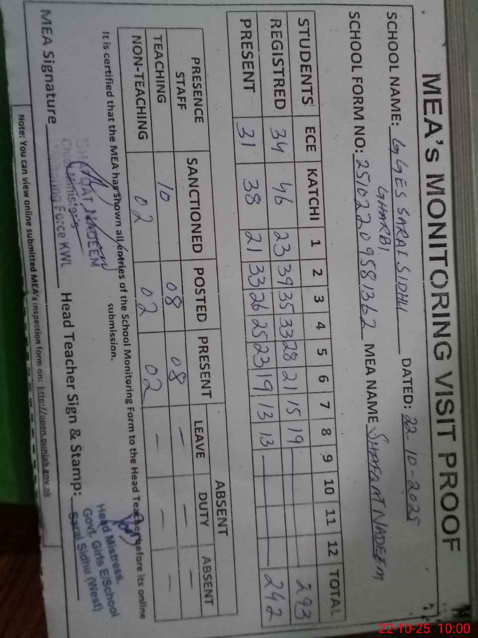 | Attendance Register | Head Teacher | MEA with School | Visit Proof |