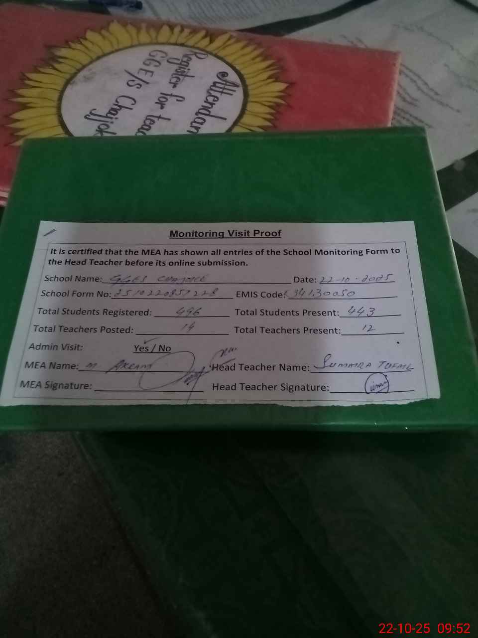 | Attendance Register | Head Teacher | MEA with School | Visit Proof |