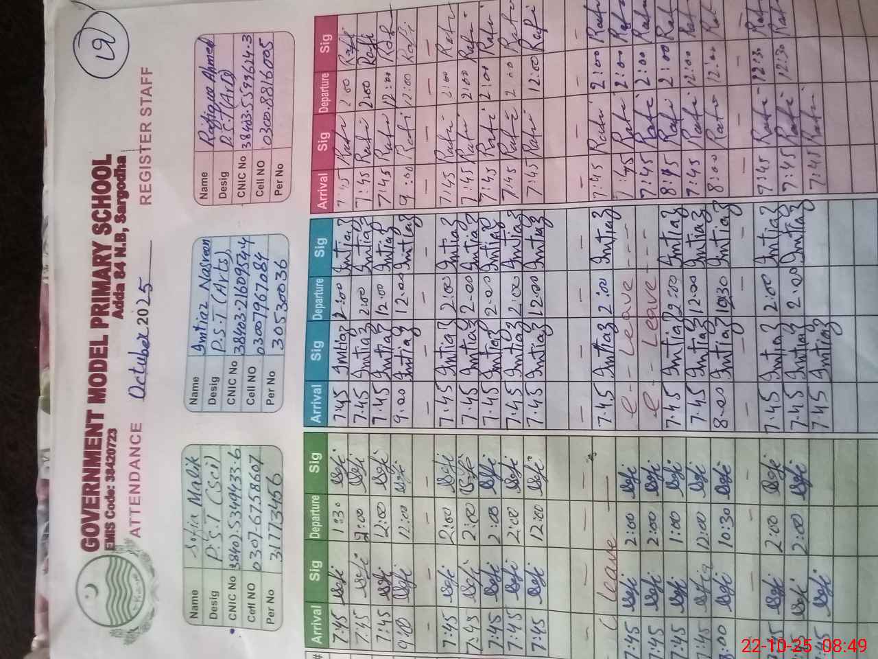 | CNIC | Full Name | Designation | R/C | Absence during last cal. month |