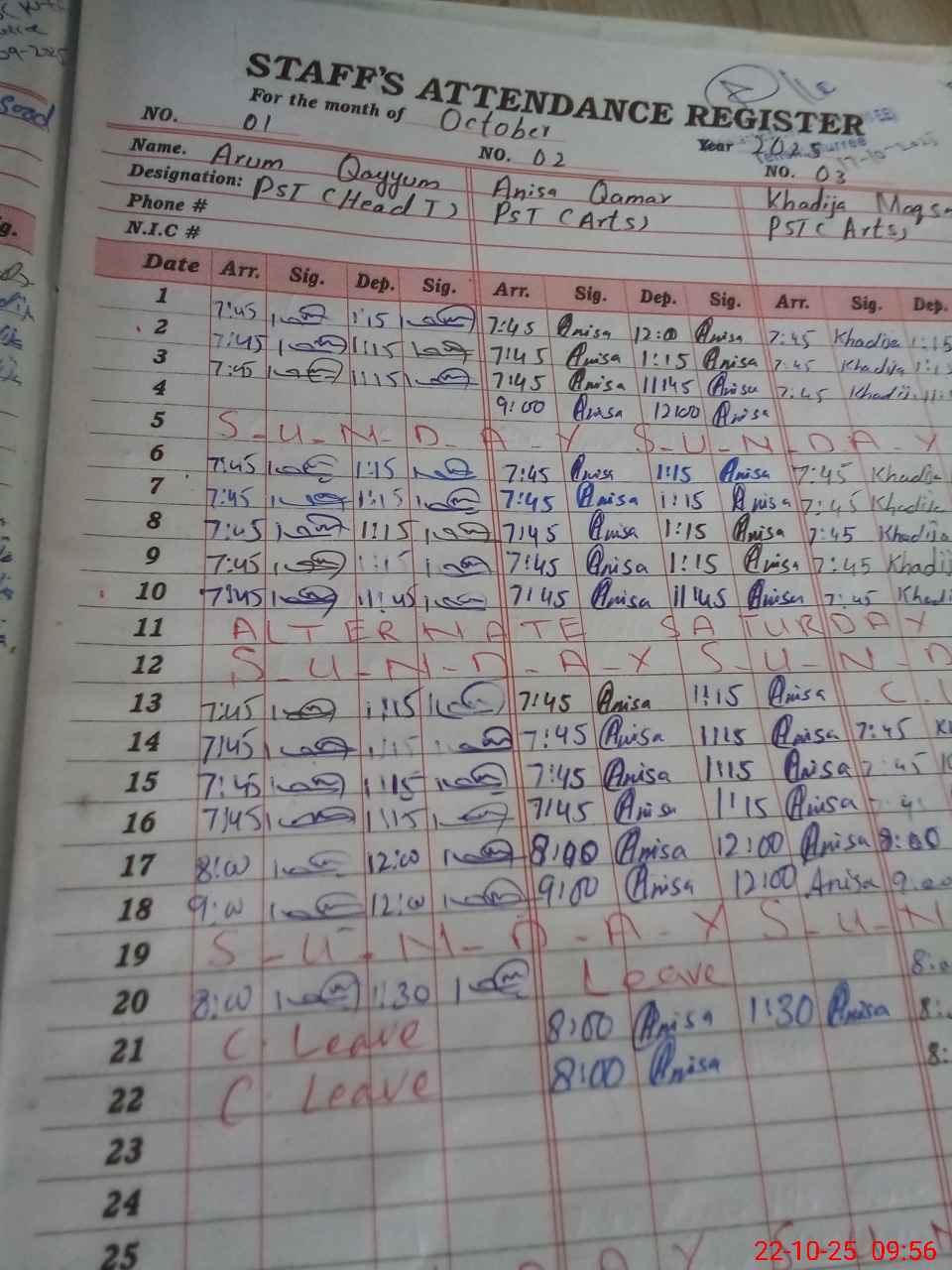 | CNIC | Full Name | Designation | R/C | Absence during last cal. month |