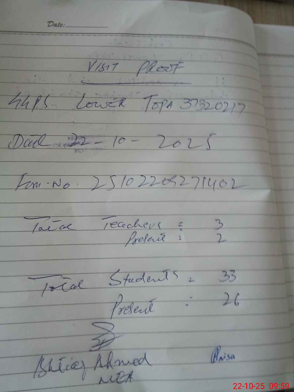 | Attendance Register | Head Teacher | MEA with School | Visit Proof |