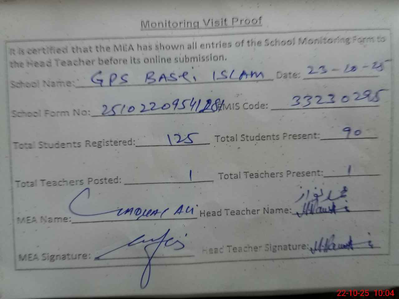| Attendance Register | Head Teacher | MEA with School | Visit Proof |
