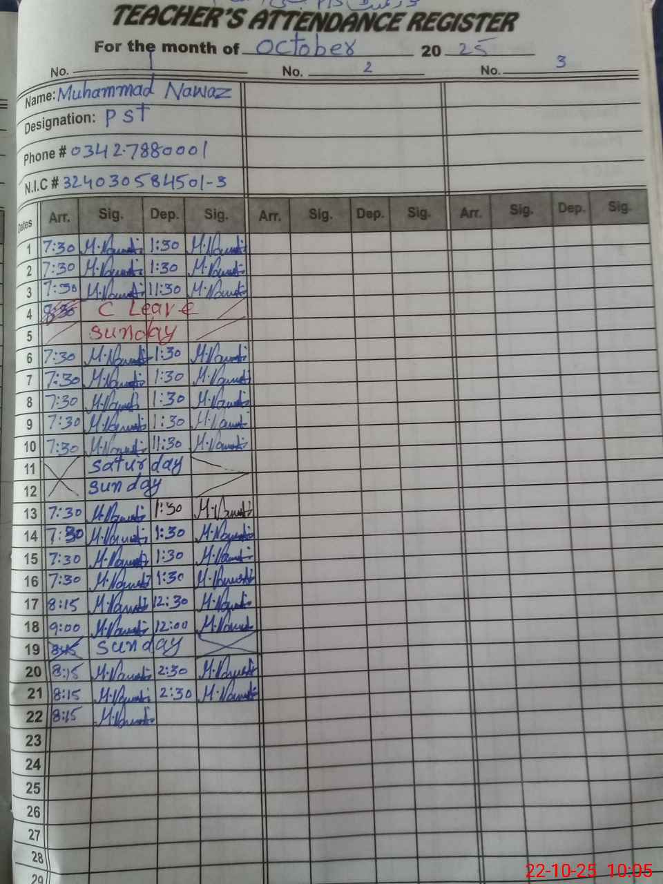 | CNIC | Full Name | Designation | R/C | Absence during last cal. month |
