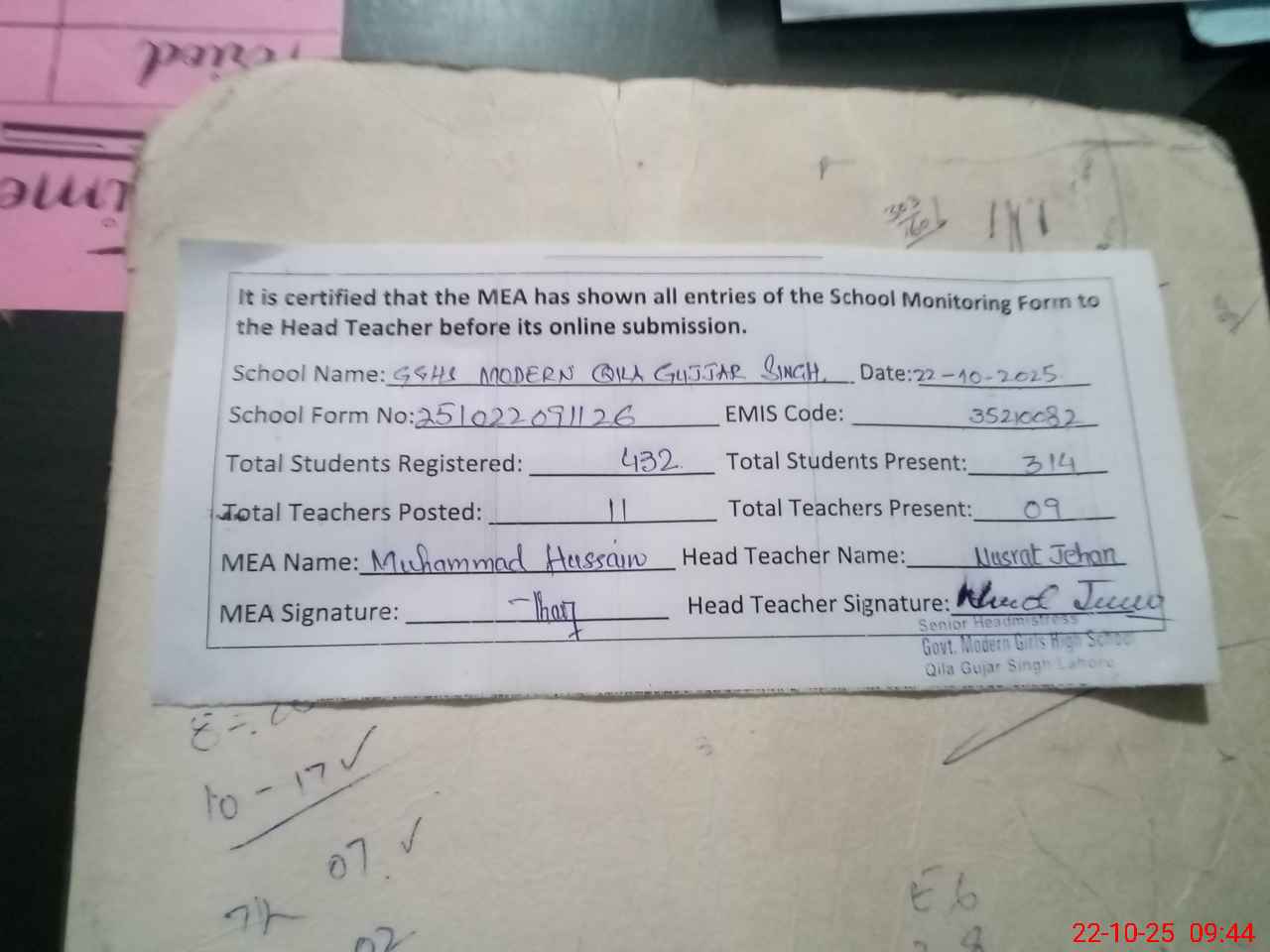 | EMIS Code: 35210082 | Name of School: GGHS MODERN QILA GUJAR SINGH | |||