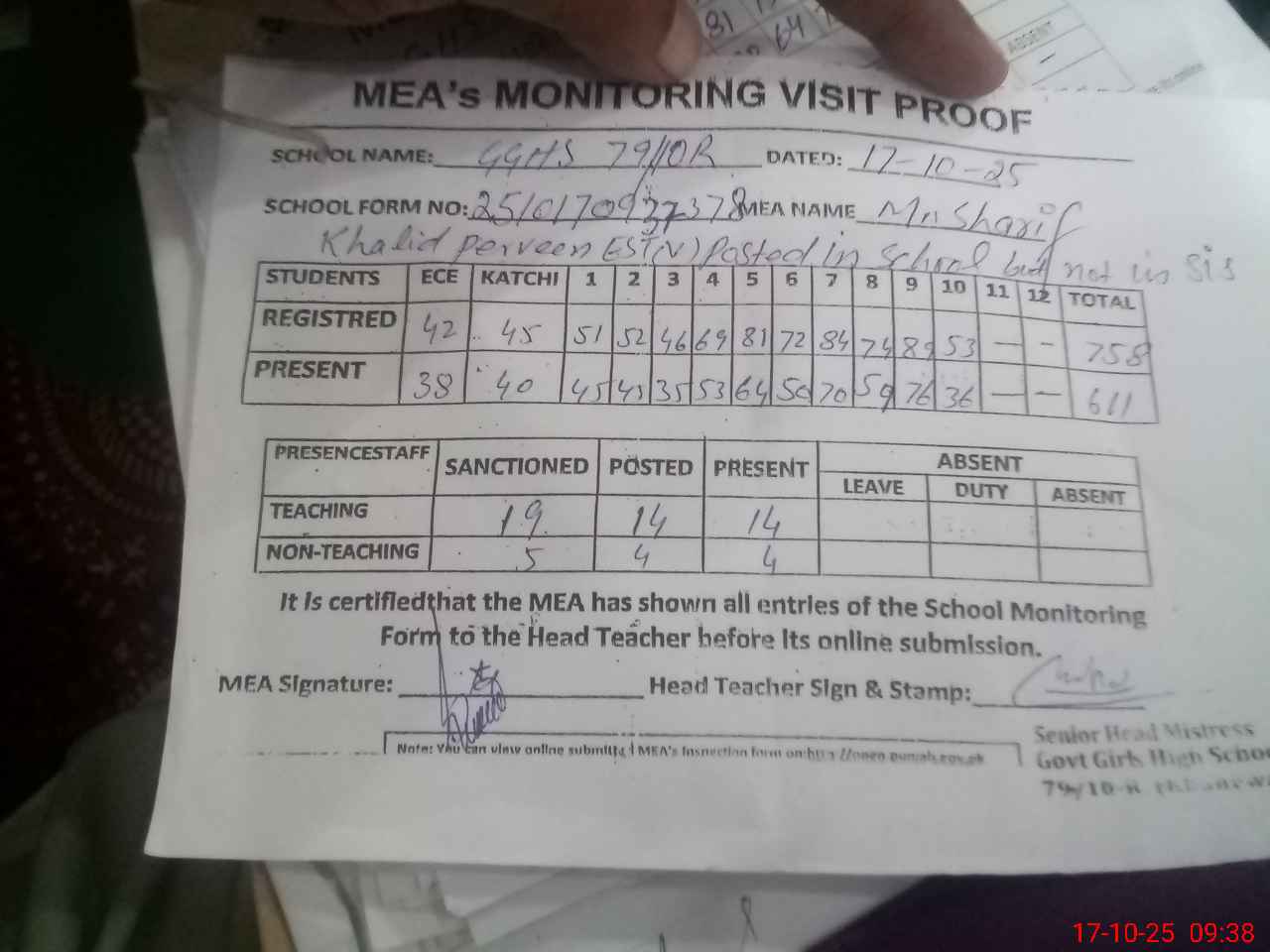 | Attendance Register | Head Teacher | MEA with School | Visit Proof |