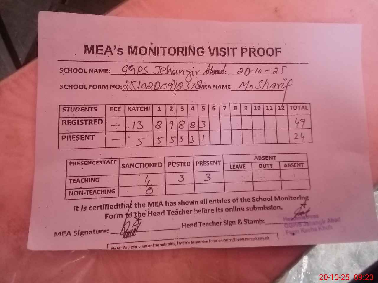 | Attendance Register | Head Teacher | MEA with School | Visit Proof |