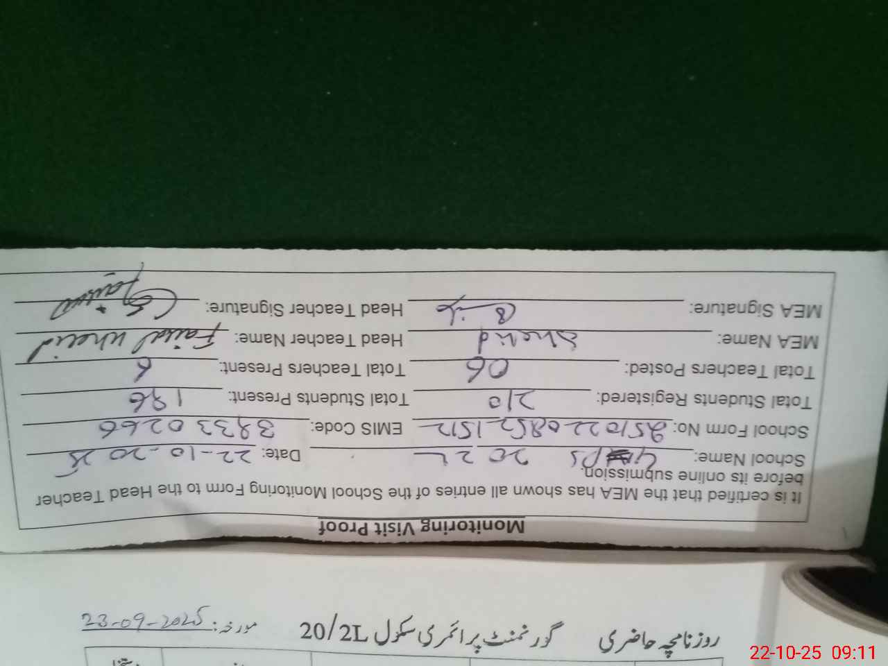| Attendance Register | Head Teacher | MEA with School | Visit Proof |