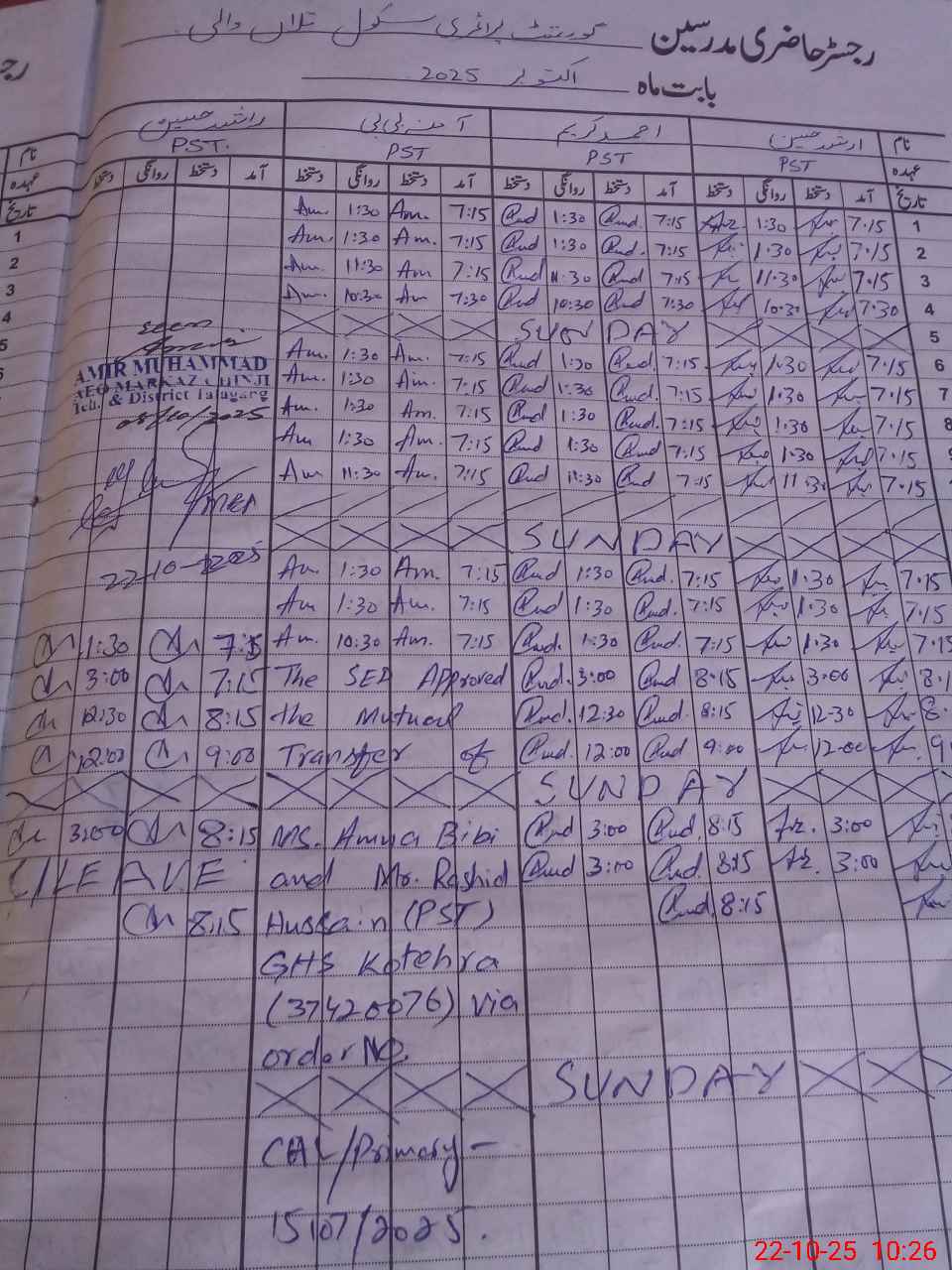 | Name: AR**** HU**** Designation: (School Headmaster's/Headmistress's) PST Phone/Cell Number: 03**** |