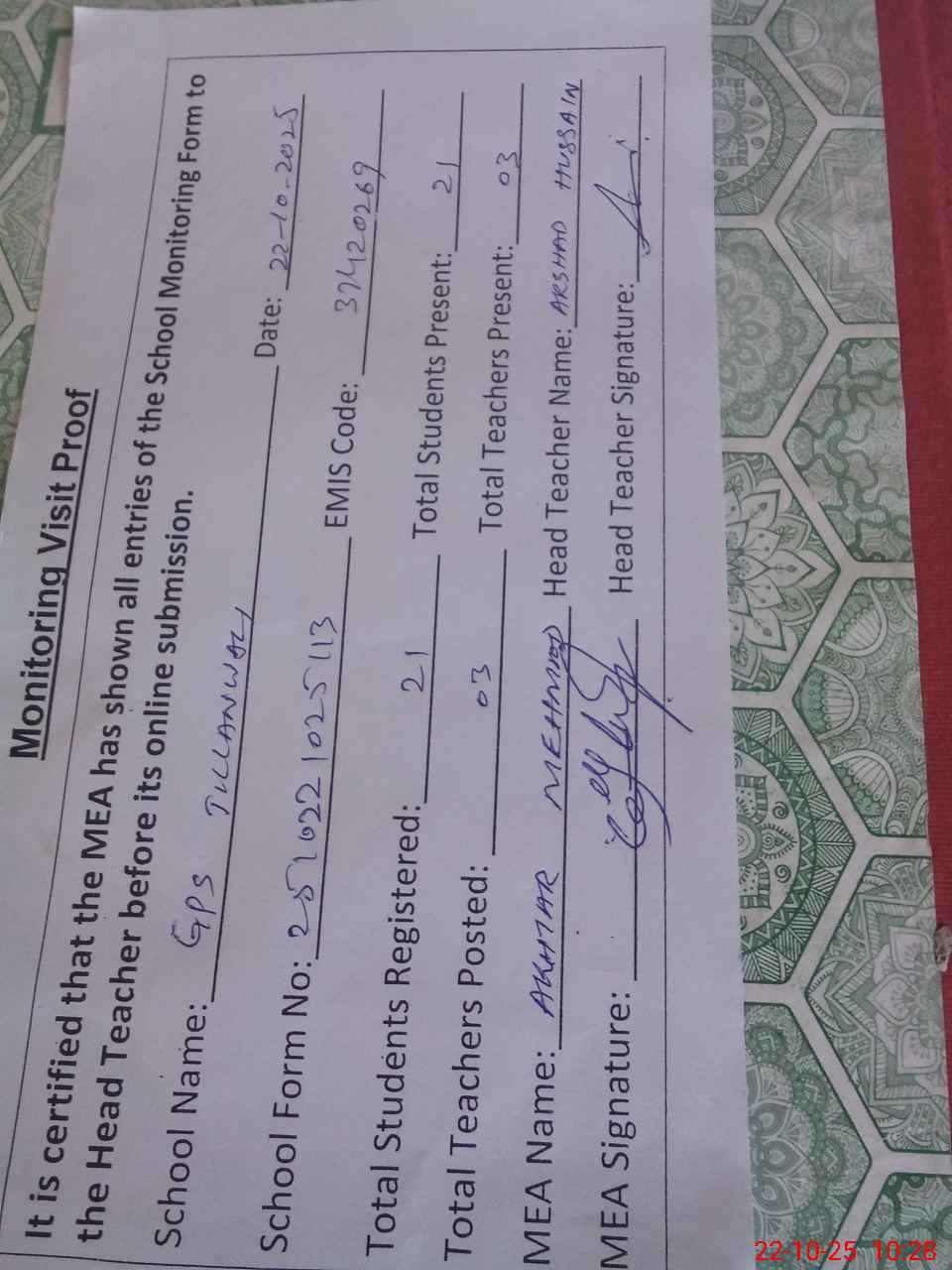 | Attendance Register | Head Teacher | MEA with School | Visit Proof |