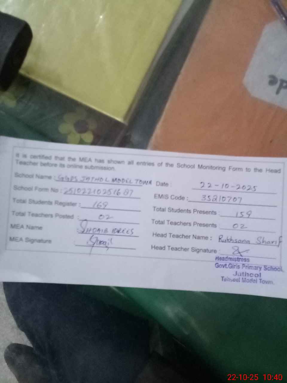 | EMIS Code: 35210707 | Name of School: GGPS JATHOL TEHSIL MODEL TOWN | |||