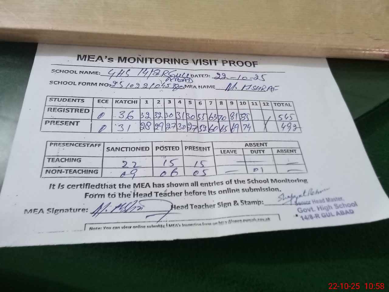 | Attendance Register | Head Teacher | MEA with School | Visit Proof |