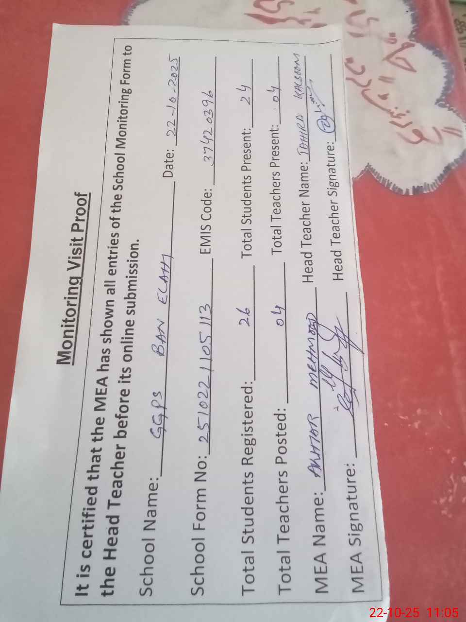 | Attendance Register | Head Teacher | MEA with School | Visit Proof |