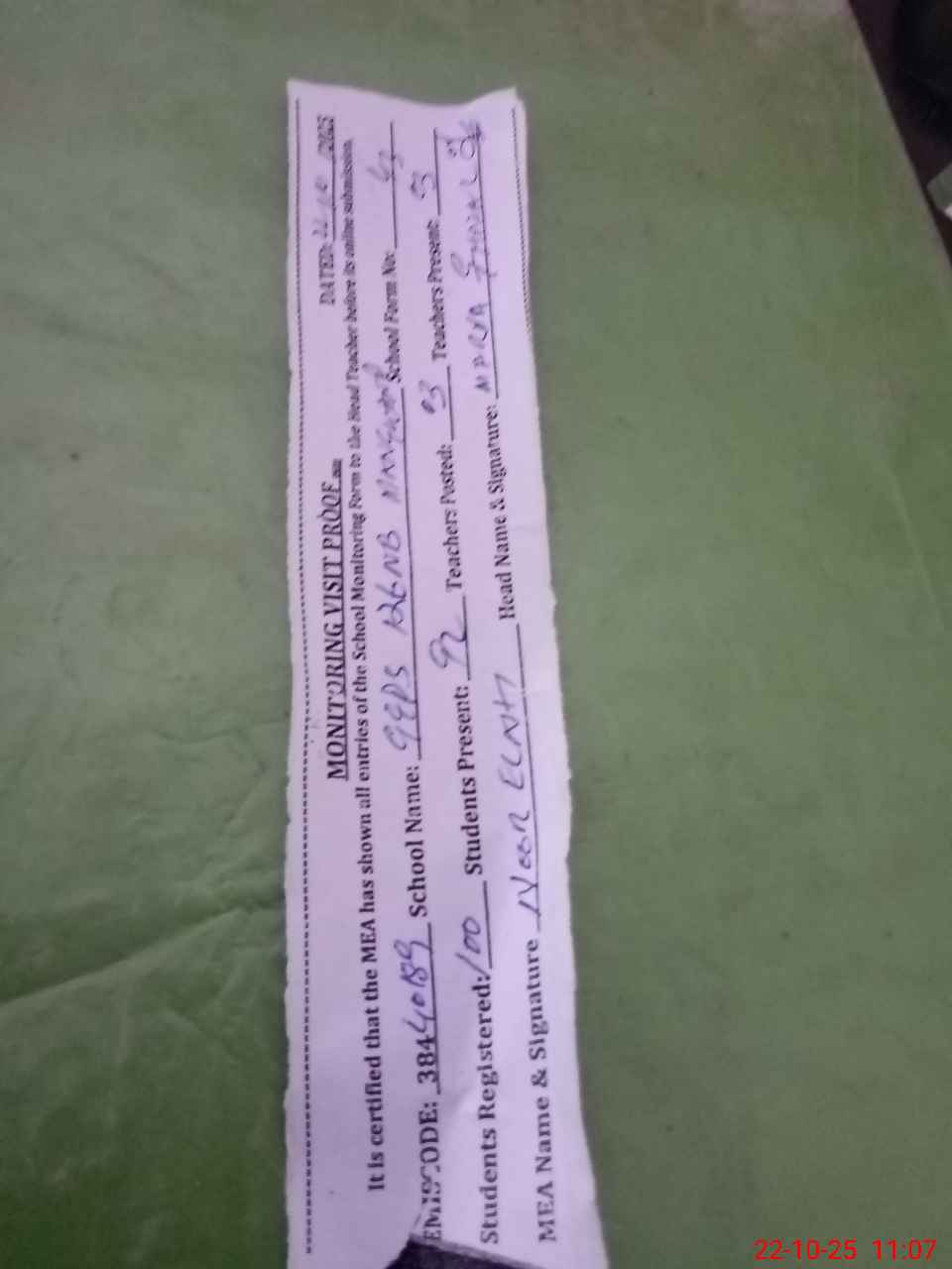 | Attendance Register | Head Teacher | MEA with School | Visit Proof |
