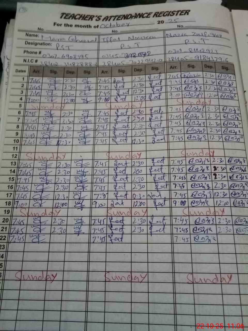| CNIC | Full Name | Designation | R/C | Absence during last cal. month |