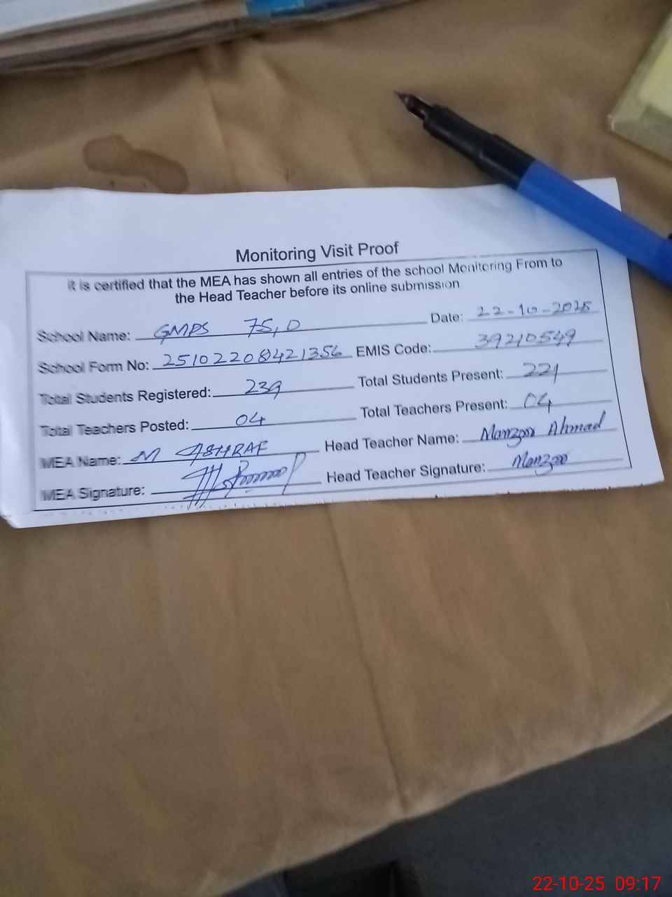 | Attendance Register | Head Teacher | MEA with School | Visit Proof |