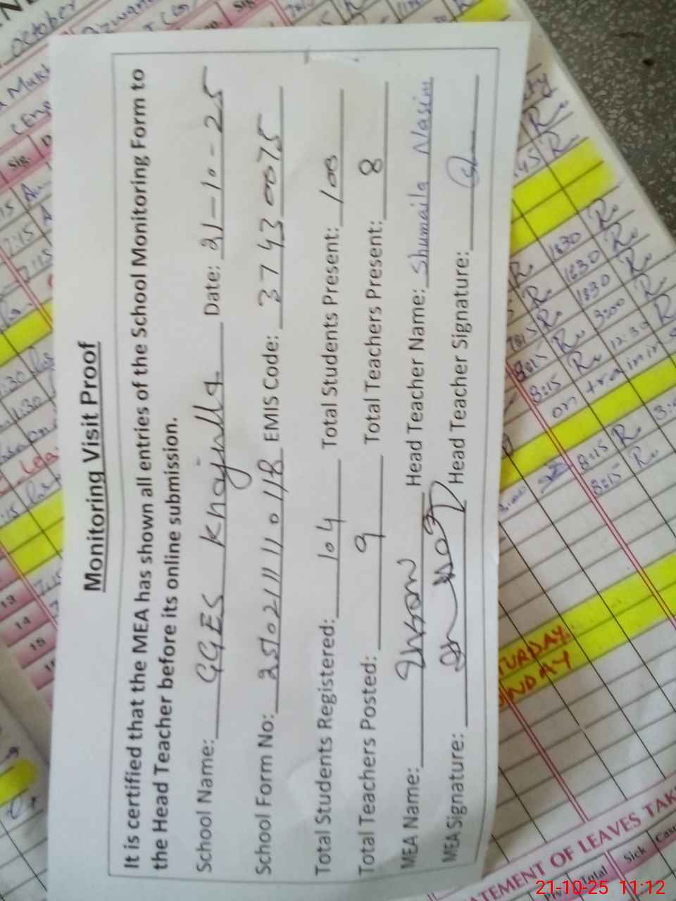 | Attendance Register | Head Teacher | MEA with School | Visit Proof |