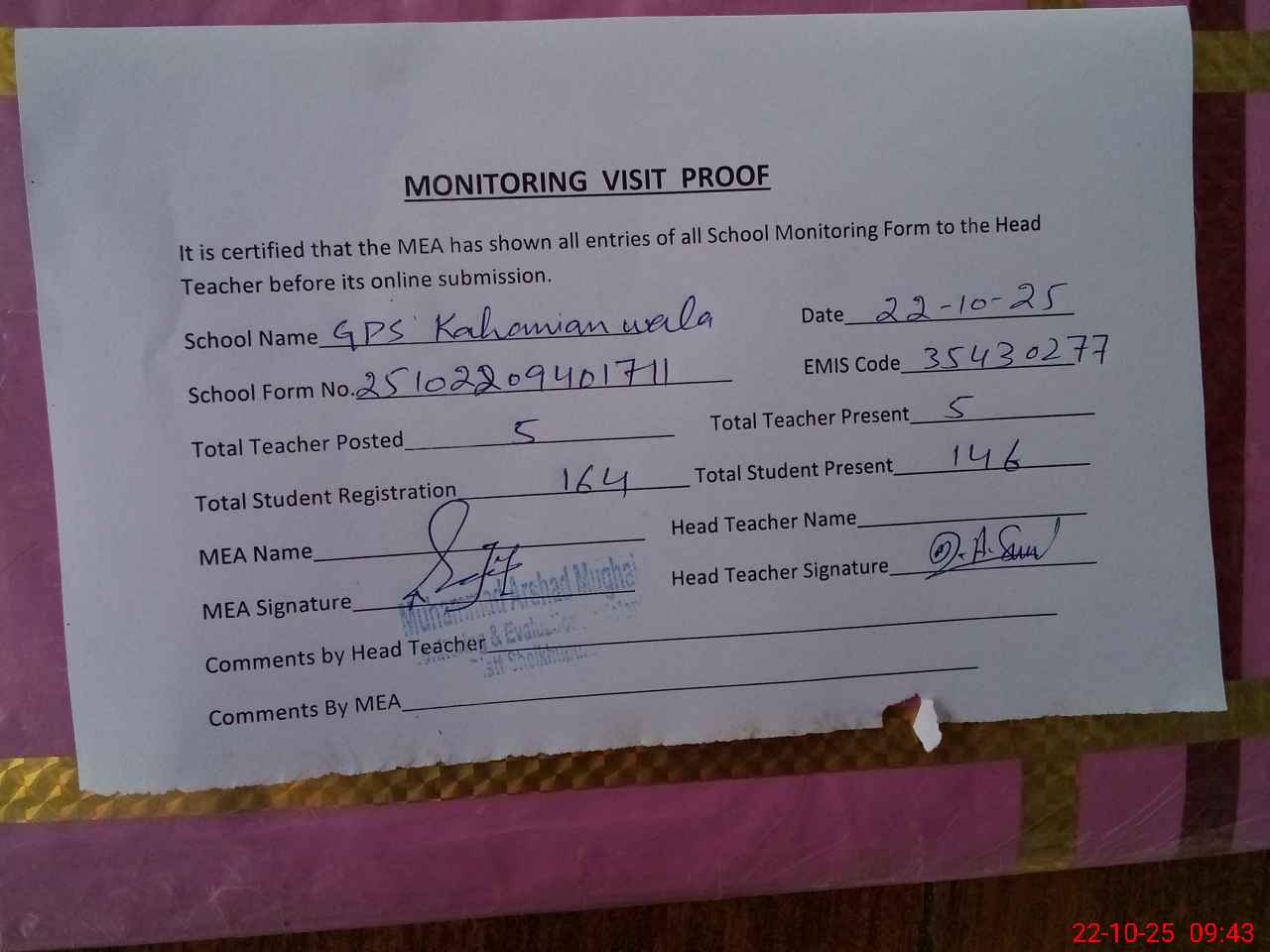 | Attendance Register | Head Teacher | MEA with School | Visit Proof |