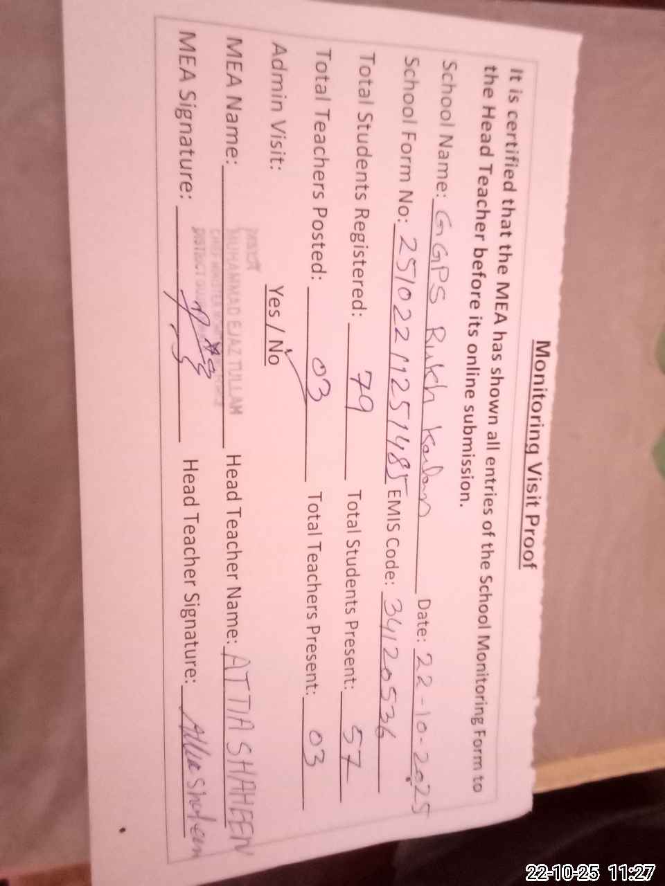 | Attendance Register | Head Teacher | MEA with School | Visit Proof |