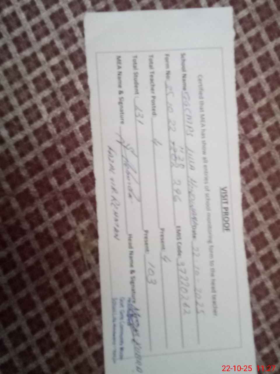 | Attendance Register | Head Teacher | MEA with School | Visit Proof |