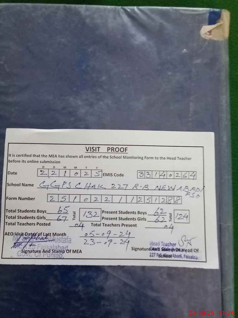 | Attendance Register | Head Teacher | MEA with School | Visit Proof |