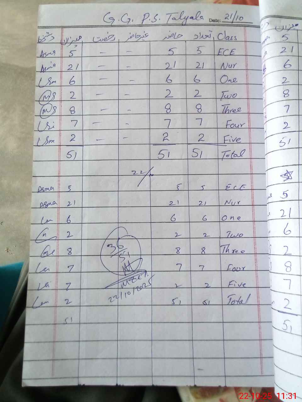 | No. of Students Present - Female | 1 | 0 | 7 | 2 | 2 | 4 | 3 | 2 | 21 | |||||||