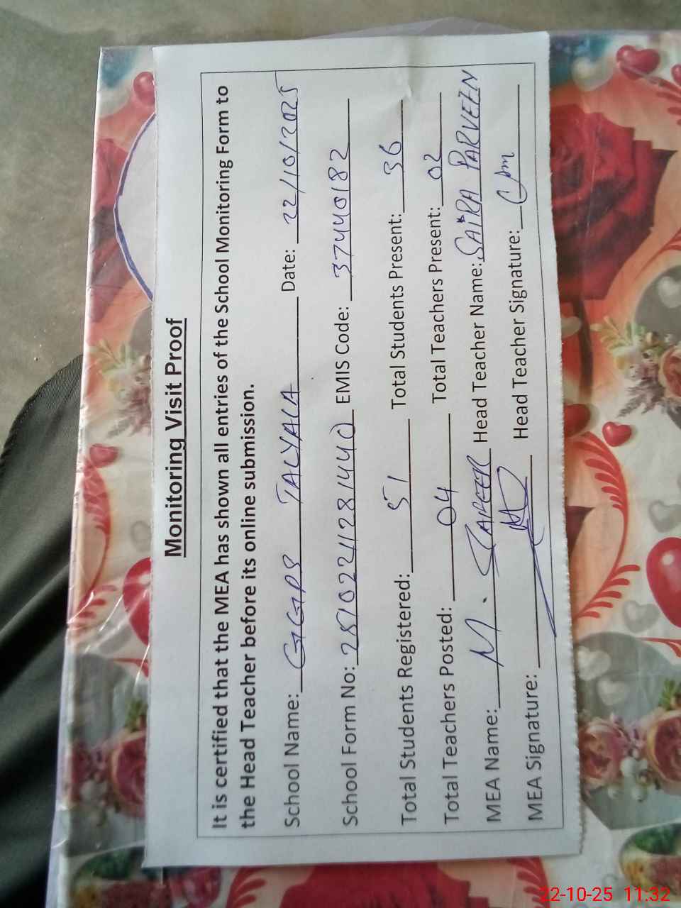 | Attendance Register | Head Teacher | MEA with School | Visit Proof |