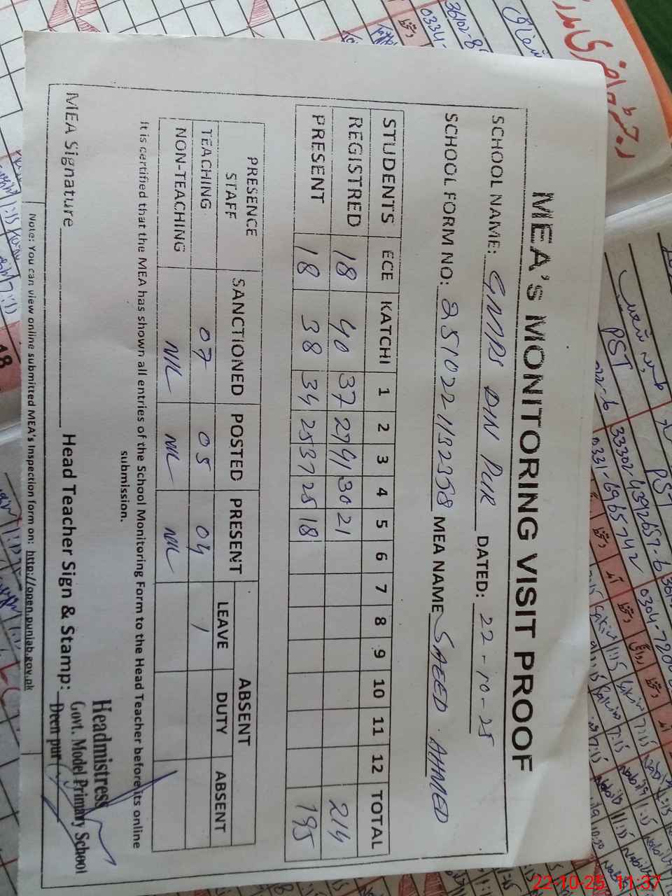 | Attendance Register | Head Teacher | MEA with School | Visit Proof |