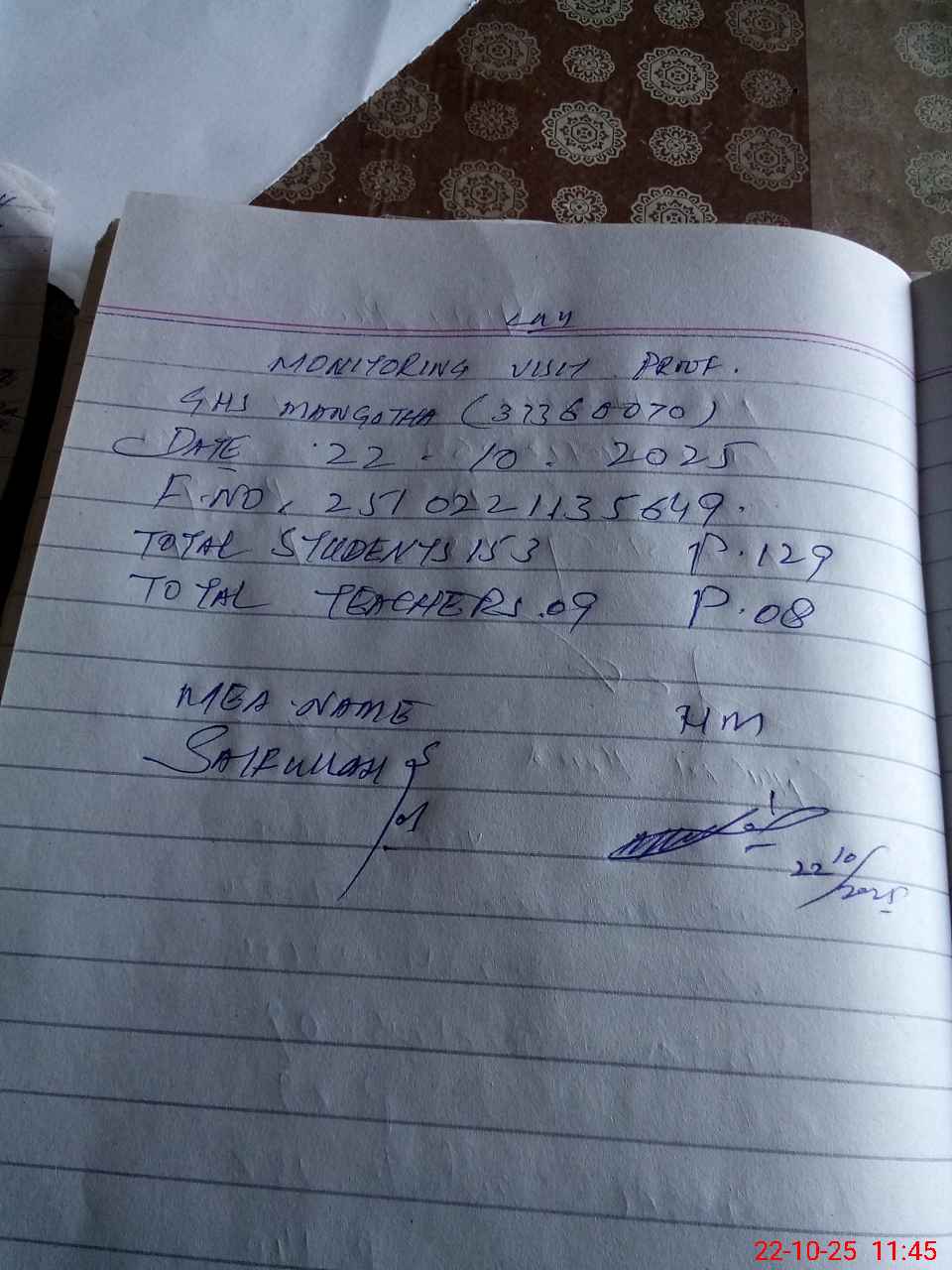 | Certified that this School was Inspected by the Undersigned MEA/DMO Today and the Information Stated Above is as Per Record. | |||||