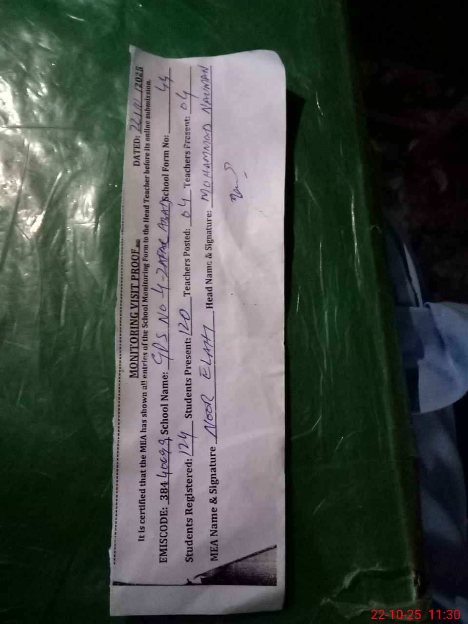 | Attendance Register | Head Teacher | MEA with School | Visit Proof |