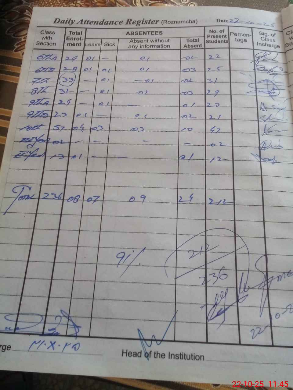 | Total Students Present | 0 | 0 | 0 | 0 | 0 | 0 | 0 | 0 | 47 | 31 | 29 | 44 | 47 | 2 | 12 | 212 |