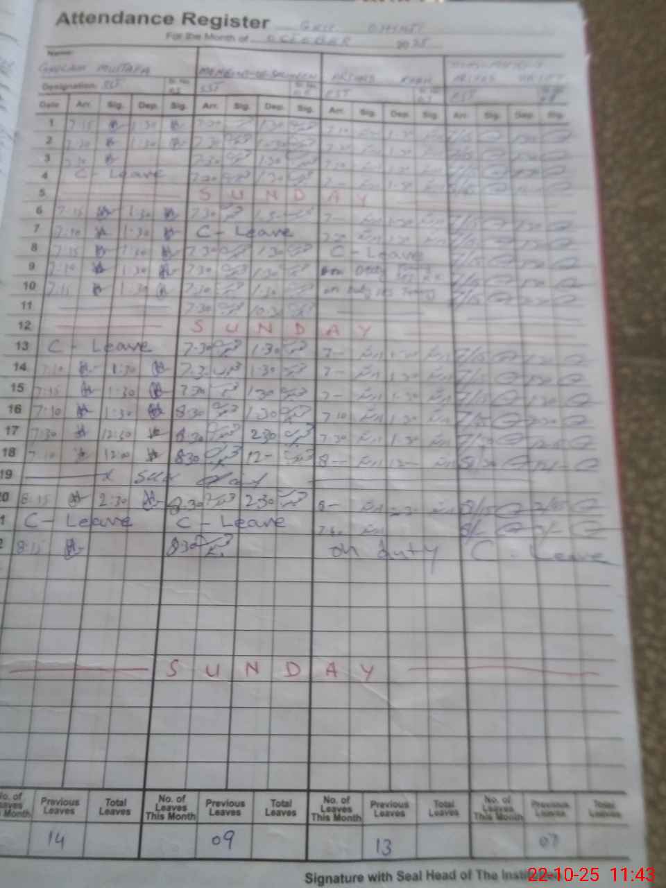 | CNIC | Full Name | Designation | R/C | Absence During Last Calender Month |