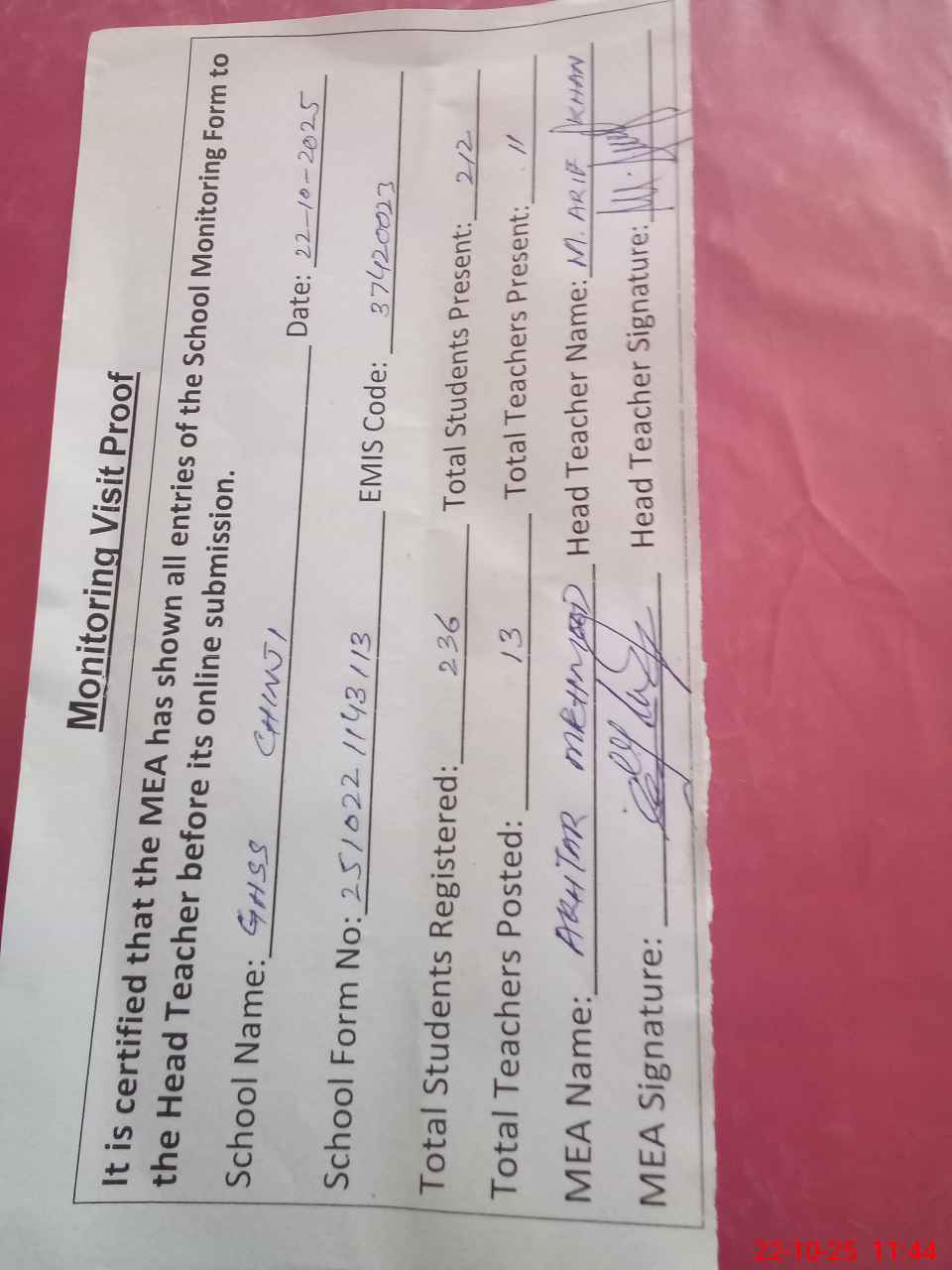 | Certified that this School was Inspected by the Undersigned MEA/DMO Today and the Information Stated Above is as Per Record. | |||||