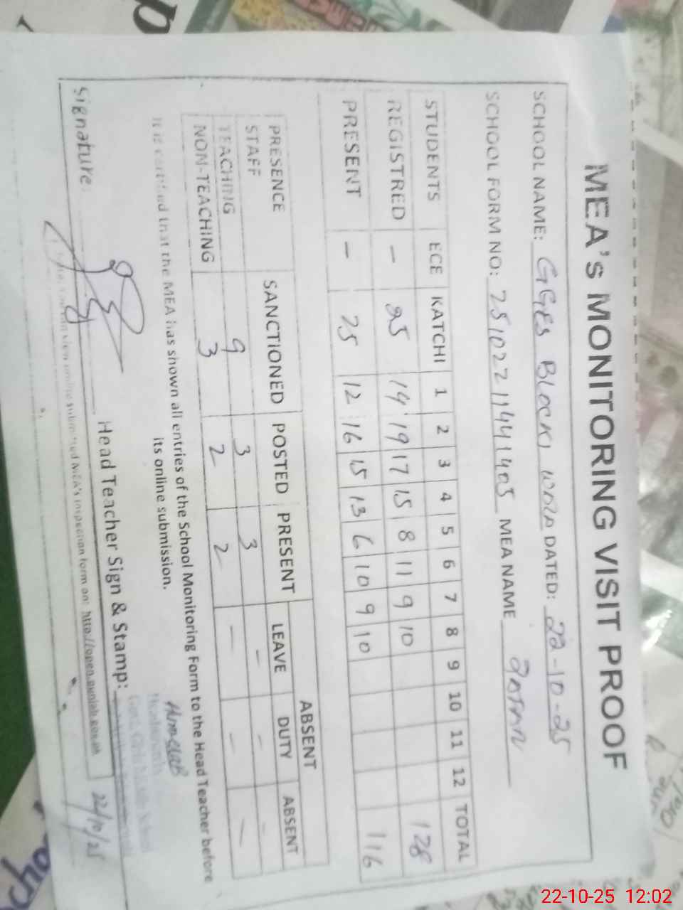 | Attendance Register | Head Teacher | MEA with School | Visit Proof |