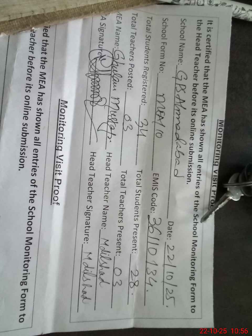 | Attendance Register | Head Teacher | MEA with School | Visit Proof |