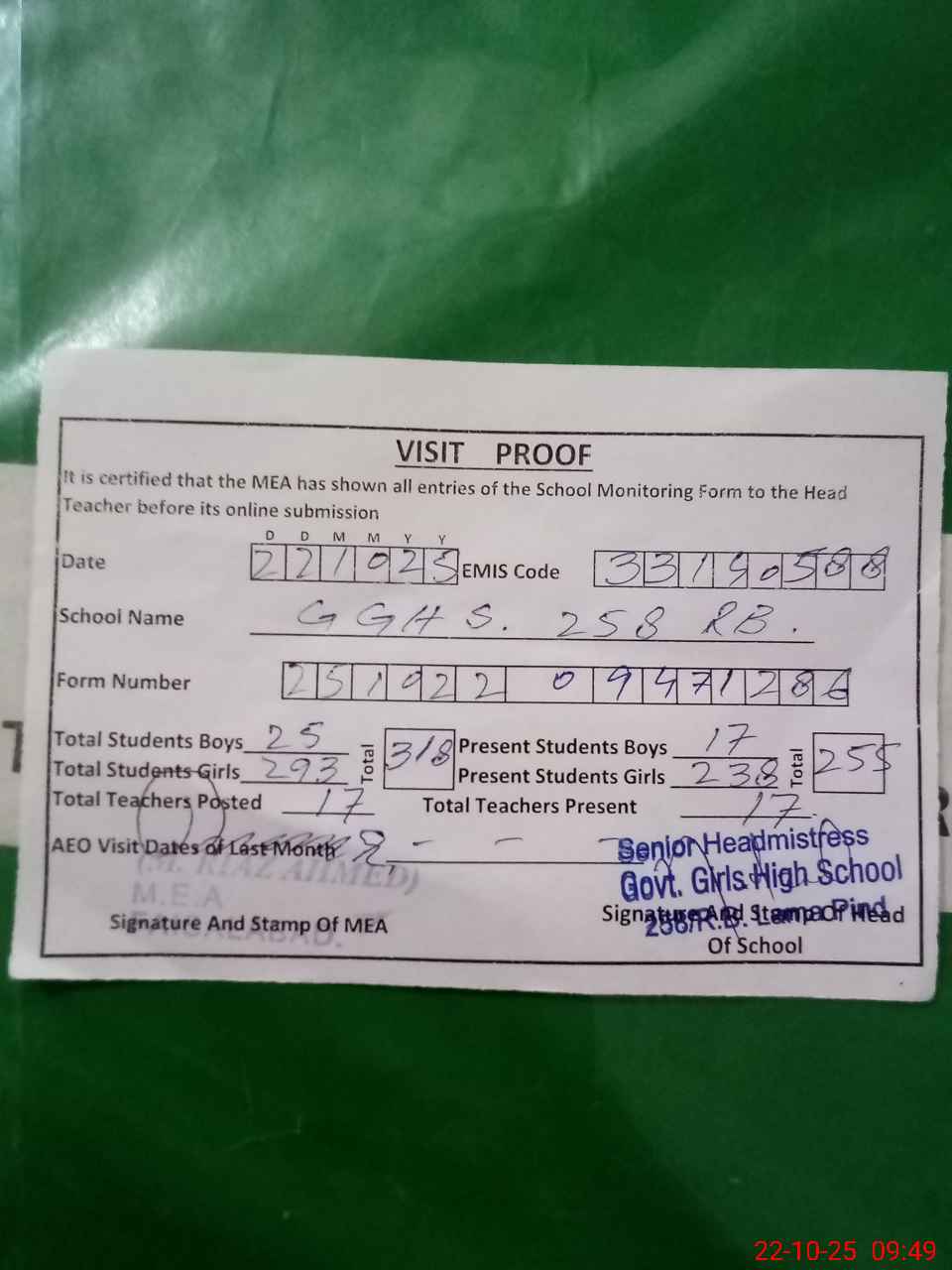 | Attendance Register | Head Teacher | MEA with School | Visit Proof |