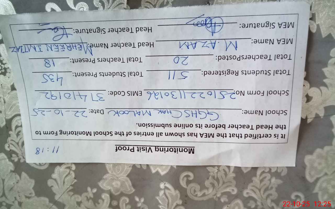 | Remarks (Use Separate Page if Required): Headmistress Shumaila Muzaffar SST and Ambreen Akhtar PST found unauthorized absent without any sanctioned leave proof during monitoring visit | |||||