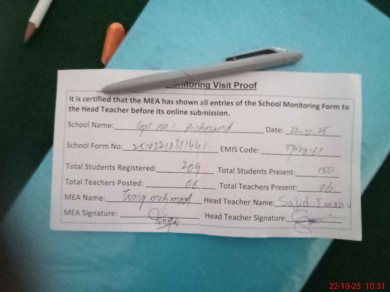 | Attendance Register | Head Teacher | MEA with School | Visit Proof |