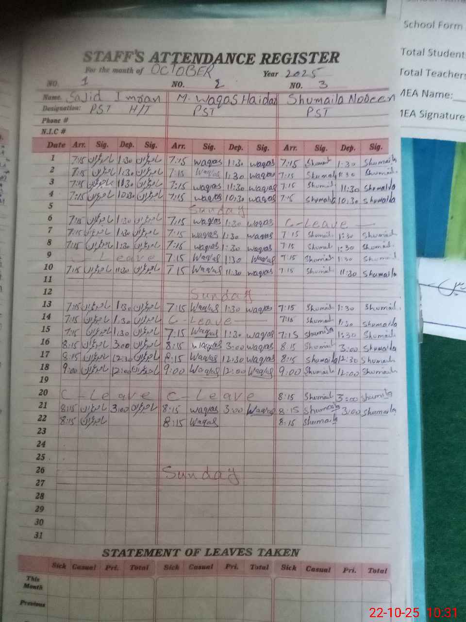 | Leave | Duty | Absent | Maternity | Medical | Ex- Pak |