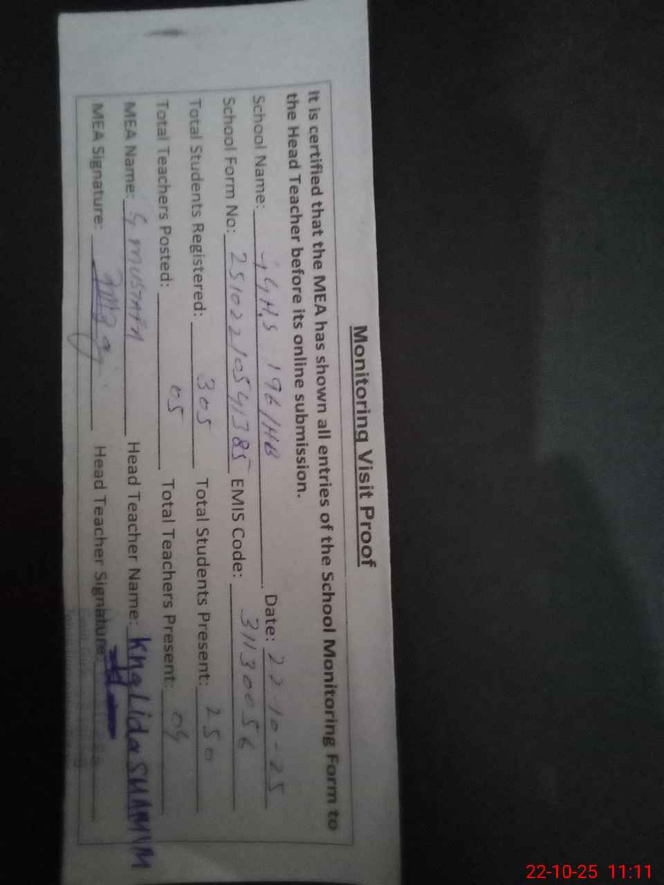 | Name: Kh**** Sh**** Designation: (School Headmaster's/Headmistress's) EST Phone/Cell Number: 03**** |