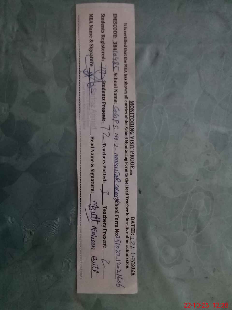 | Certified that this School was Inspected by the Undersigned MEA/DMO Today and the Information Stated Above is as Per Record. | |||||
