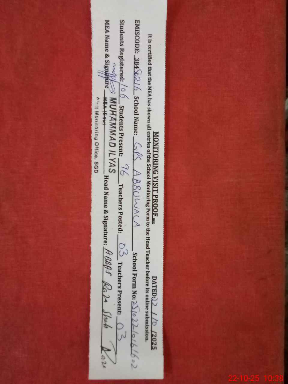 | Certified that this School was Inspected by the Undersigned MEA/DMO Today and the Information Stated Above is as Per Record. | |||||