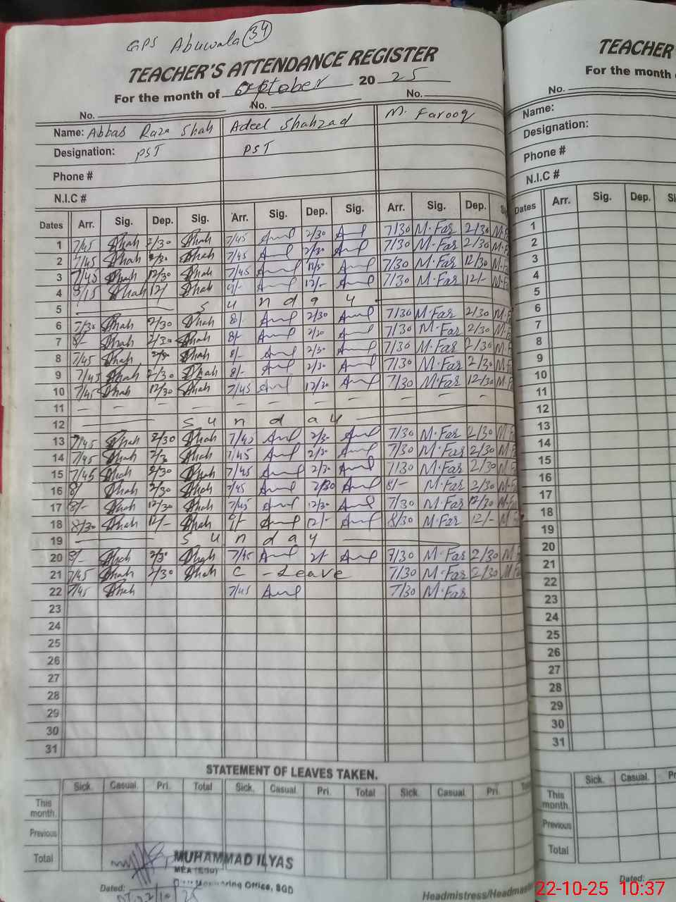 | CNIC | Full Name | Designation | R/C | Absence During Last Calender Month |