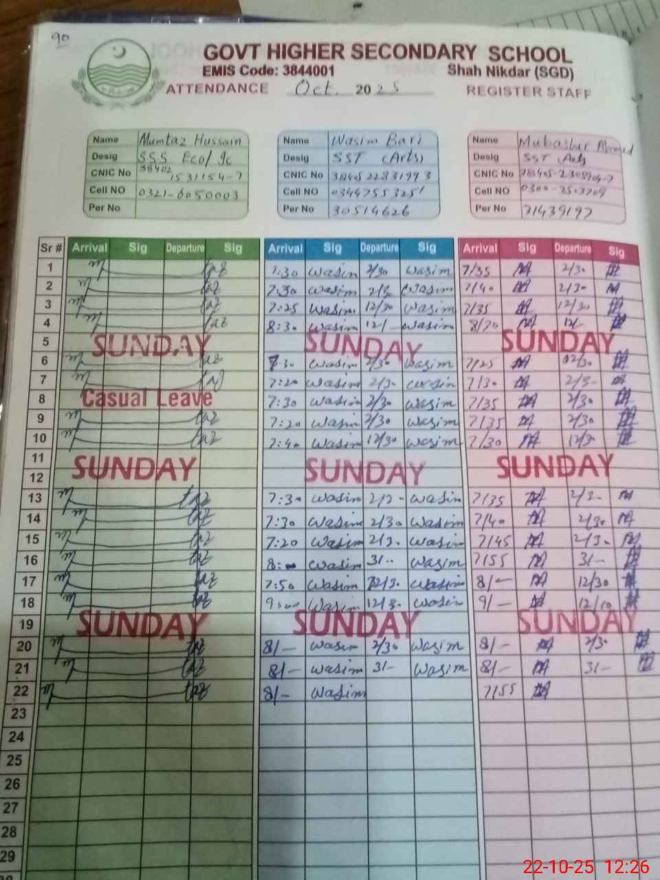 | CNIC | Full Name | Designation | R/C | Absence during last cal. month |