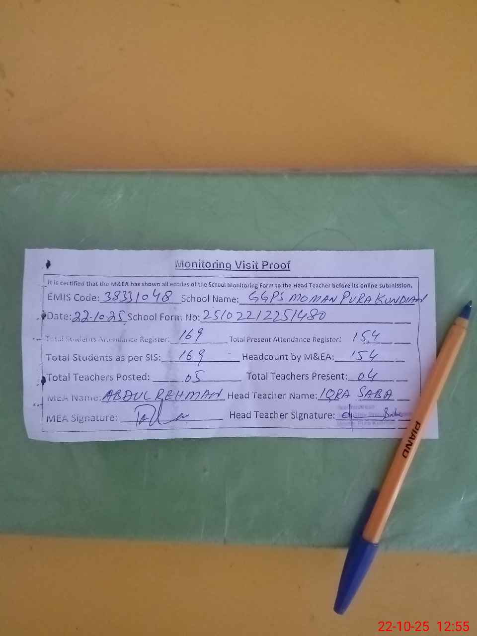 | Attendance Register | Head Teacher | MEA with School | Visit Proof |