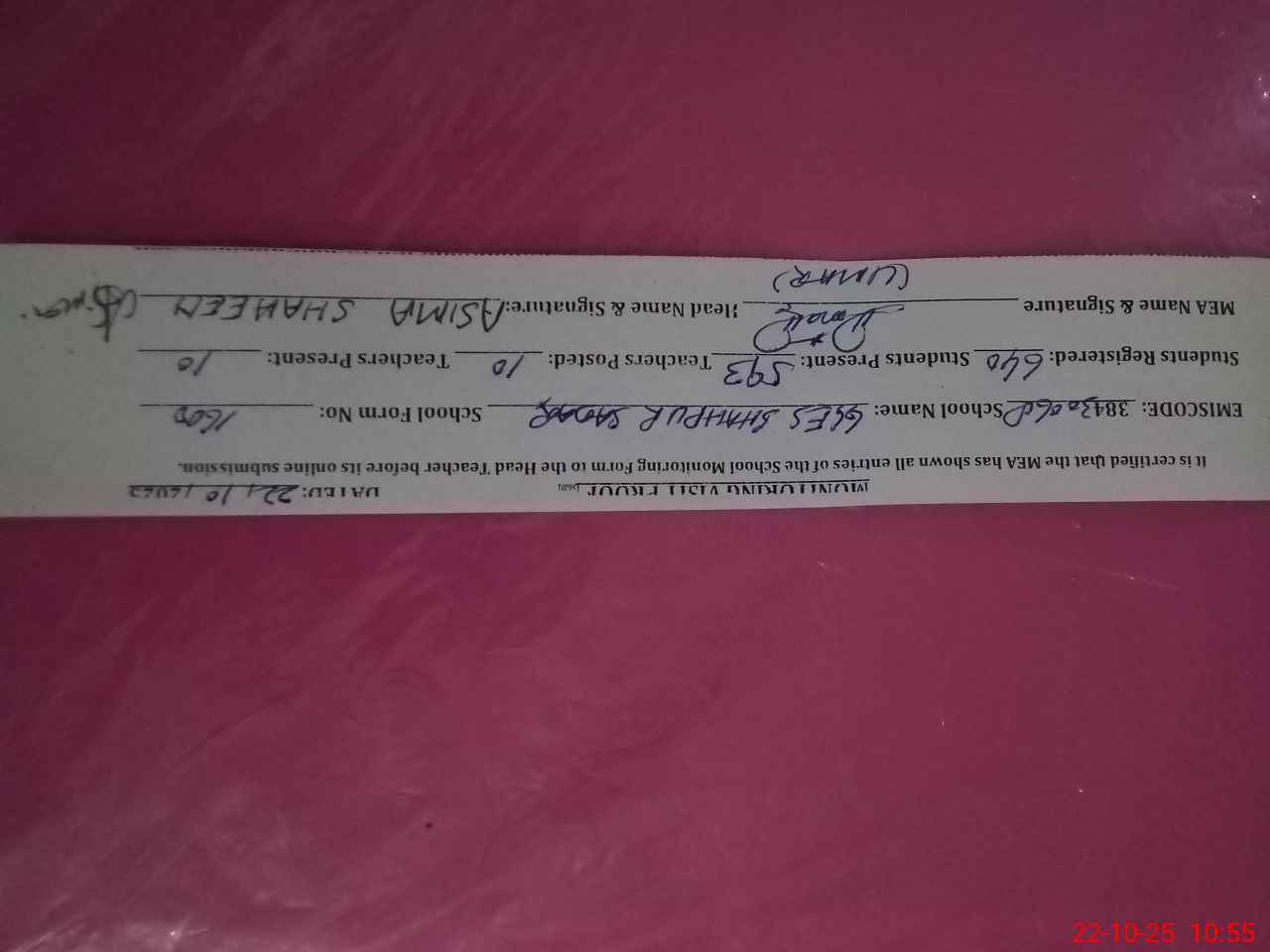 | Name: AS**** SH**** Designation: (School Headmaster's/Headmistress's) EST Phone/Cell Number: 03**** |