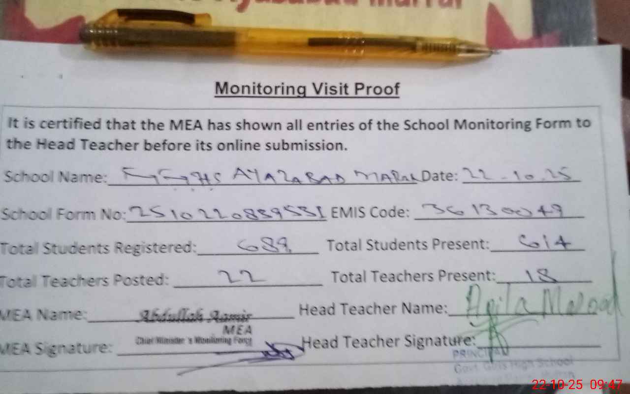| EMIS Code: 36130049 | Name of School: GGHS AYAZABAD MARAL MULTAN | |||