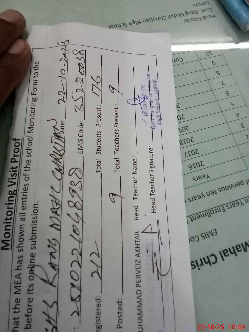 | Certified that this School was Inspected by the Undersigned MEA/DMO Today and the Information Stated Above is as Per Record. | |||||