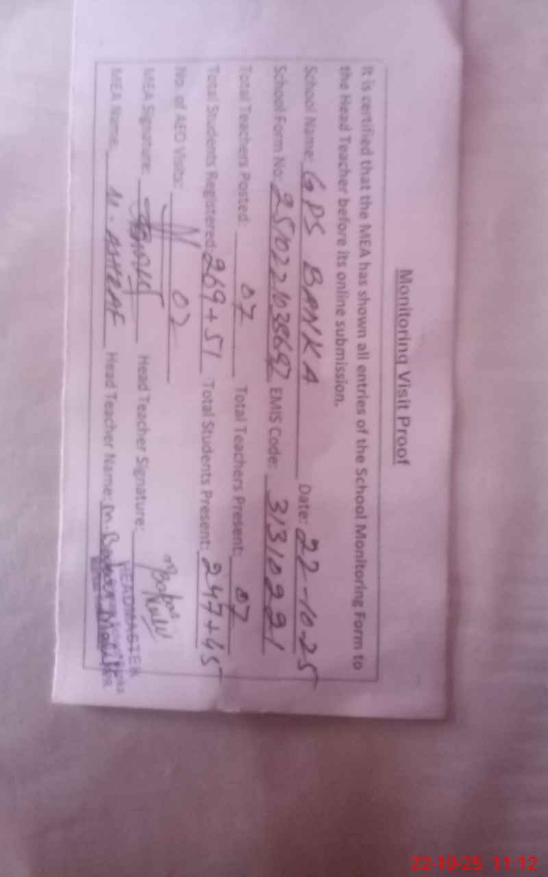 | EMIS Code: 31310221 | Name of School: GPS BANKA (After Noon) | |||
