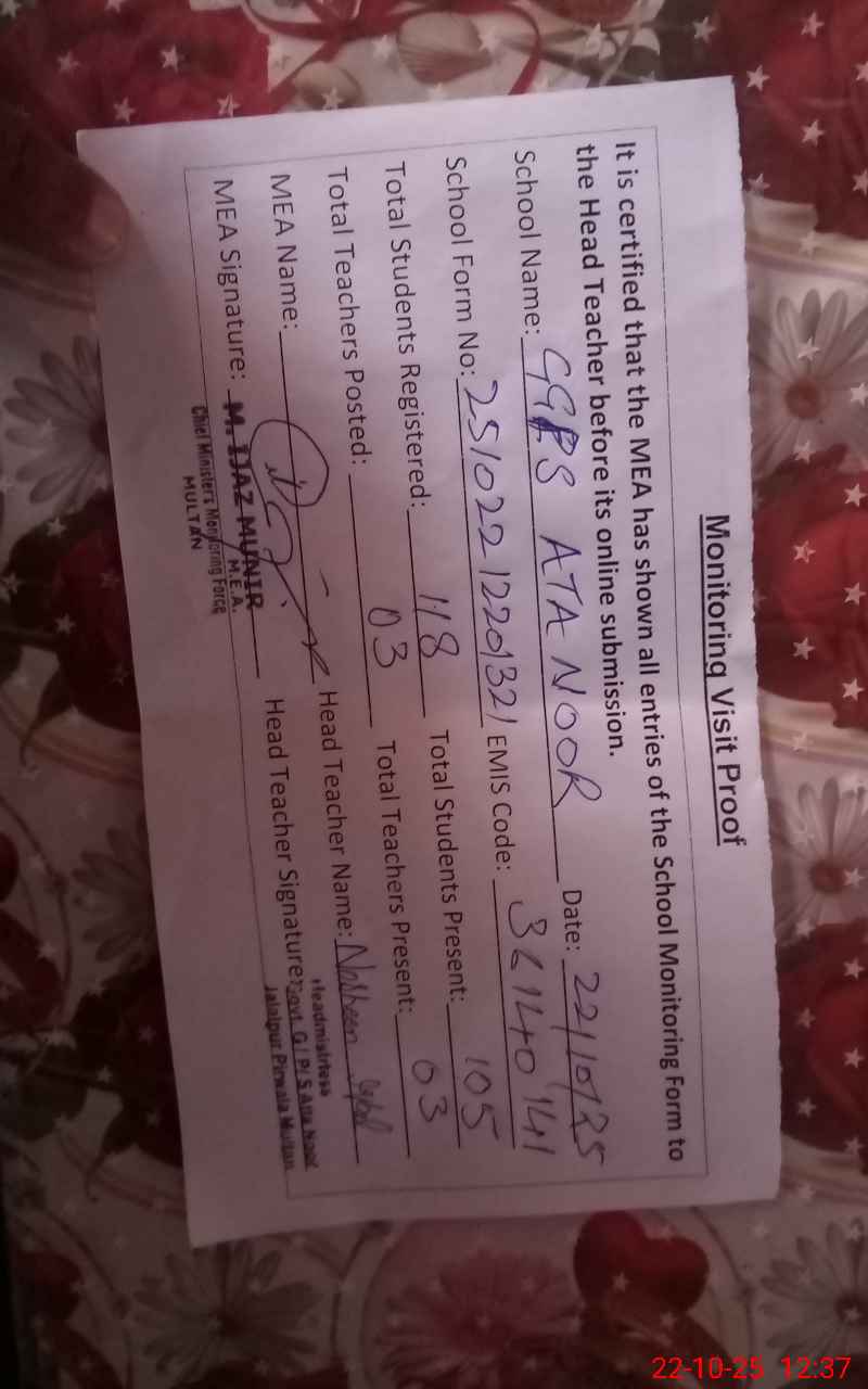 | EMIS Code: 36140141 | Name of School: GGPS BASTI ATA NOOR | |||